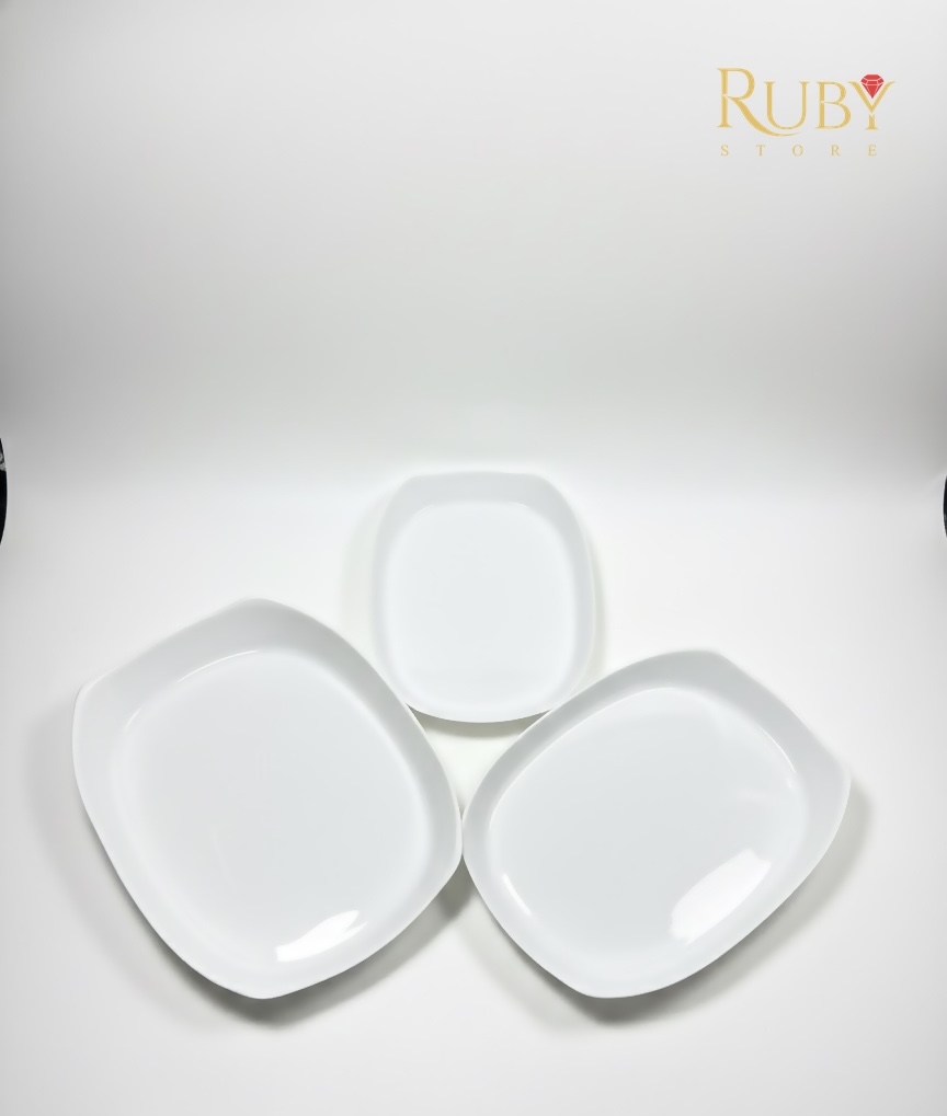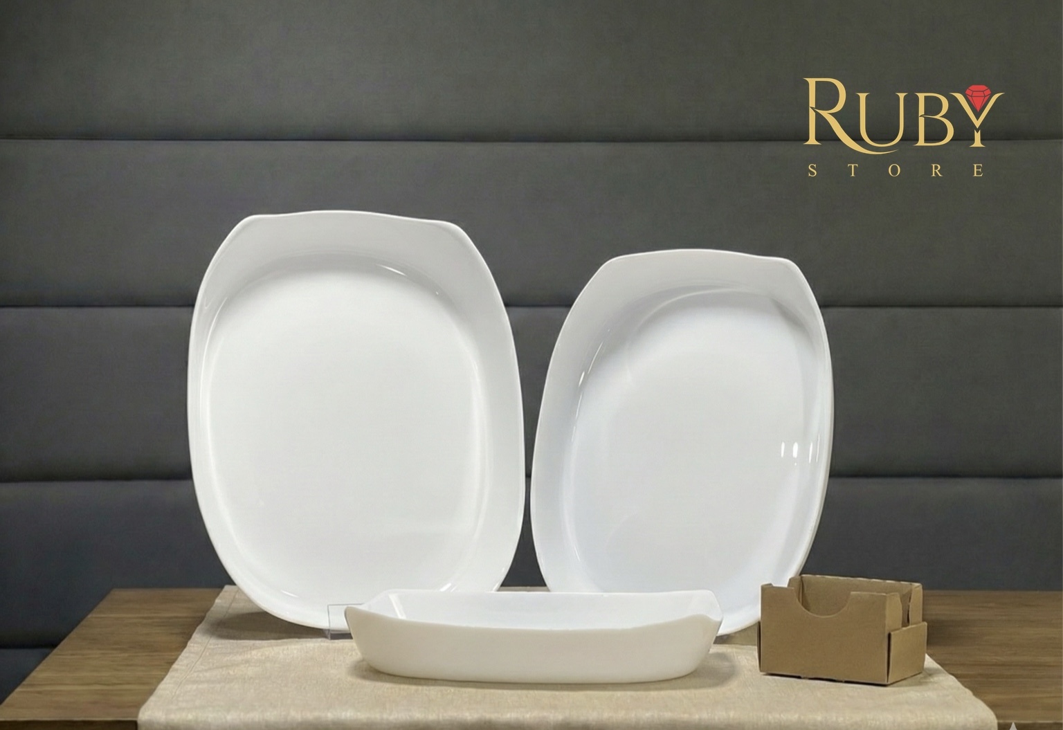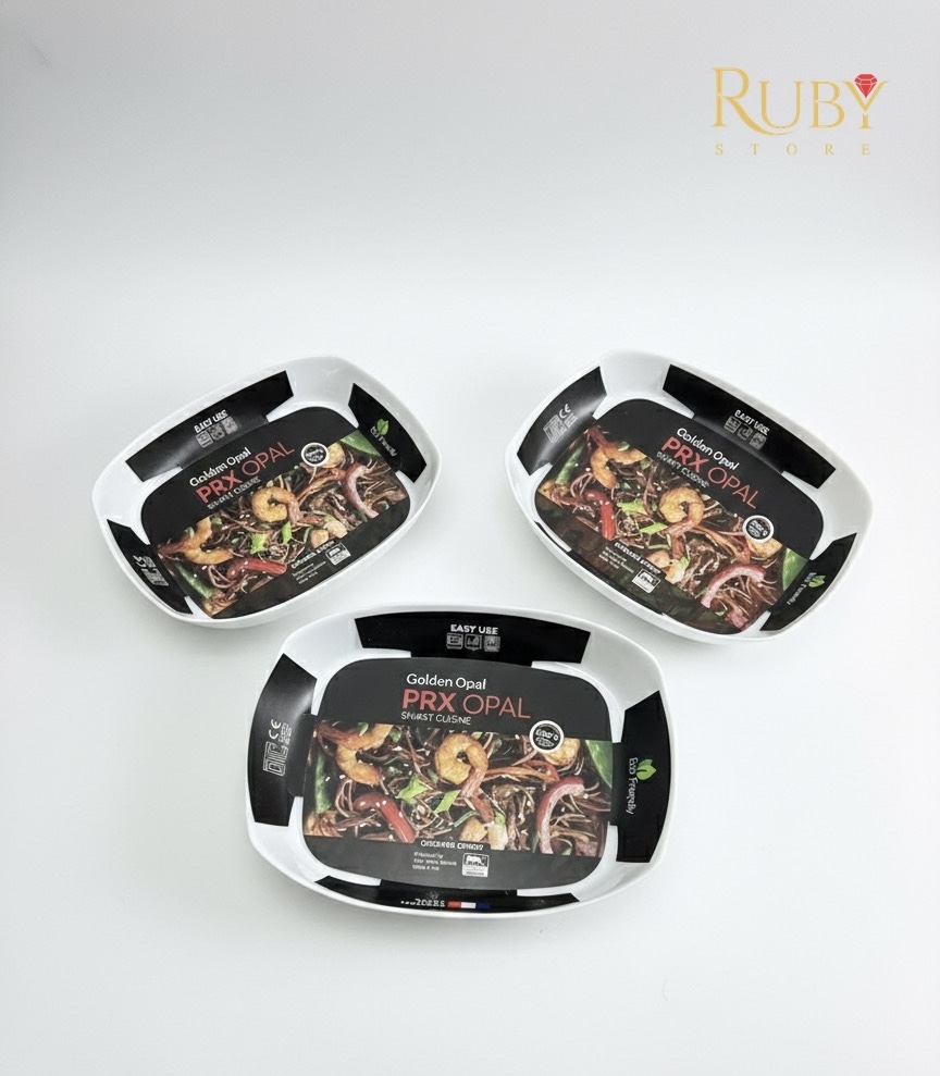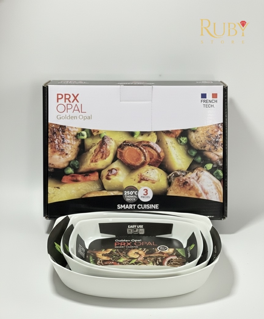 ست سه تیکه مستطیل کارین تولید شرکت گلدن اپال ازجنس ارکوپال سفید قابلیت استفاده در ماکروویو و فر در دمای بالا از این ظروف برای پخت و پز در حرارت غیر مسقیم و سرو غذا استفاده کرد و قابلیت استفاده در ماشین ظرفشویی را دارند